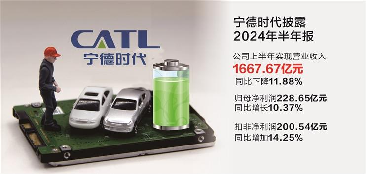 7月26日晚,宁德时代(300750)披露2024年半年报,公司上半年实现营业收入1667.67亿元,同比下降11.88%;归母净利润228.65亿元,同比增长10.37%;扣非净利润200.54亿元,同比增加14.25%。从财报来看,公司在动力电池和储能电池系统继续保持全球领先,且今年上半年的毛利率继续呈回升态势。
