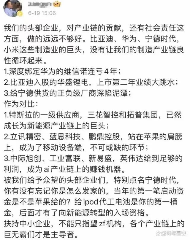 前不久,网上有一个贴子引发了大家的关注。该贴子称中国的头部企业,对产业链的贡献,还有社会责任这方面,做的远远不够好。比亚迪、华为、宁德时代,小米这些制造业的巨头,没有让我们的制造产业链良性循环起来。