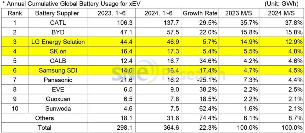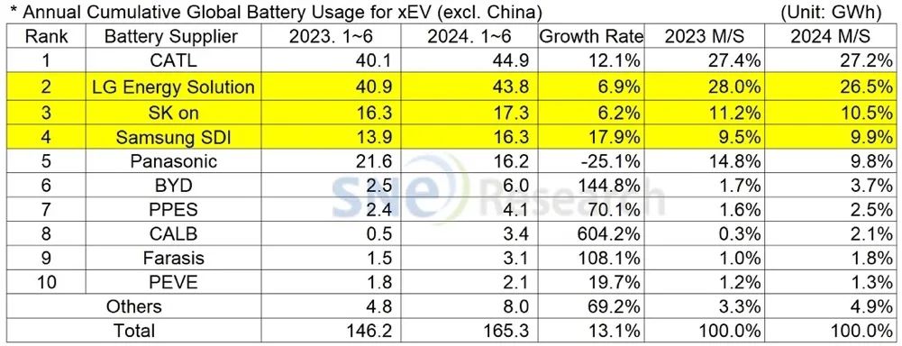 而在除中国以外的海外市场中,宁德时代占有率虽微降0.2个百分点,但由于LG(即LG Energy Solution)下滑幅度高达1.5个百分点,使宁德时代夺回排名首位的行业地位。尤其是宁德时代的累计销量同比增速,几乎达到了LG的两倍。