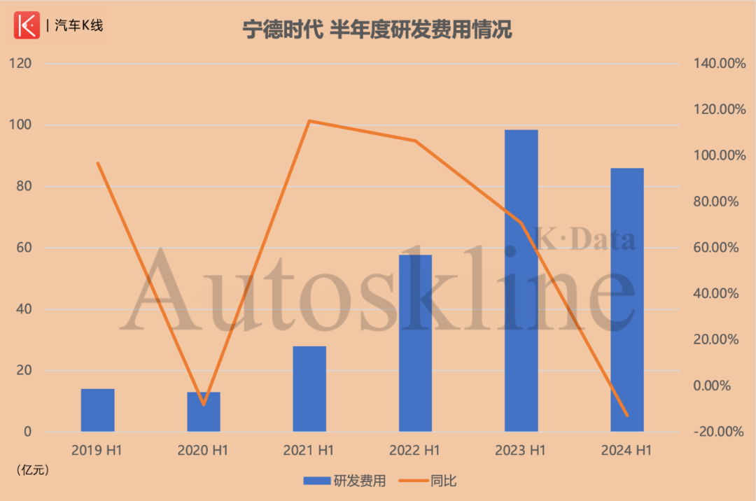 然而实际上,据财报披露,宁德时代今年上半年研发费用同比下降12.77%,为85.92亿元,虽然创下了历史同期第二高的水准,但同时也是除2020年外,同期唯一一次出现同比收缩,且降幅创历史同期之最。