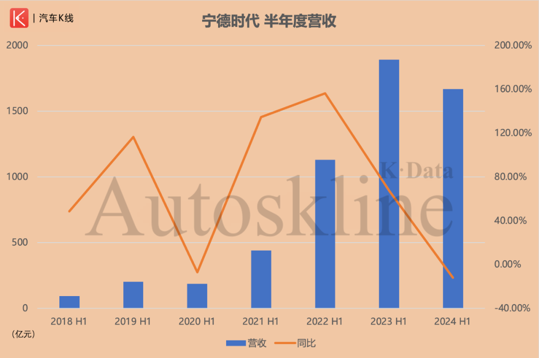 但当时的宁德时代尚处于半年度仅有200亿元的营收规模,且同比下降幅度仅为7.08%,而今天的宁德时代,半年度营收已近站在千亿之上,朝着2000亿元的高度进发,同比降幅却达到两位数,创历年同期之最。