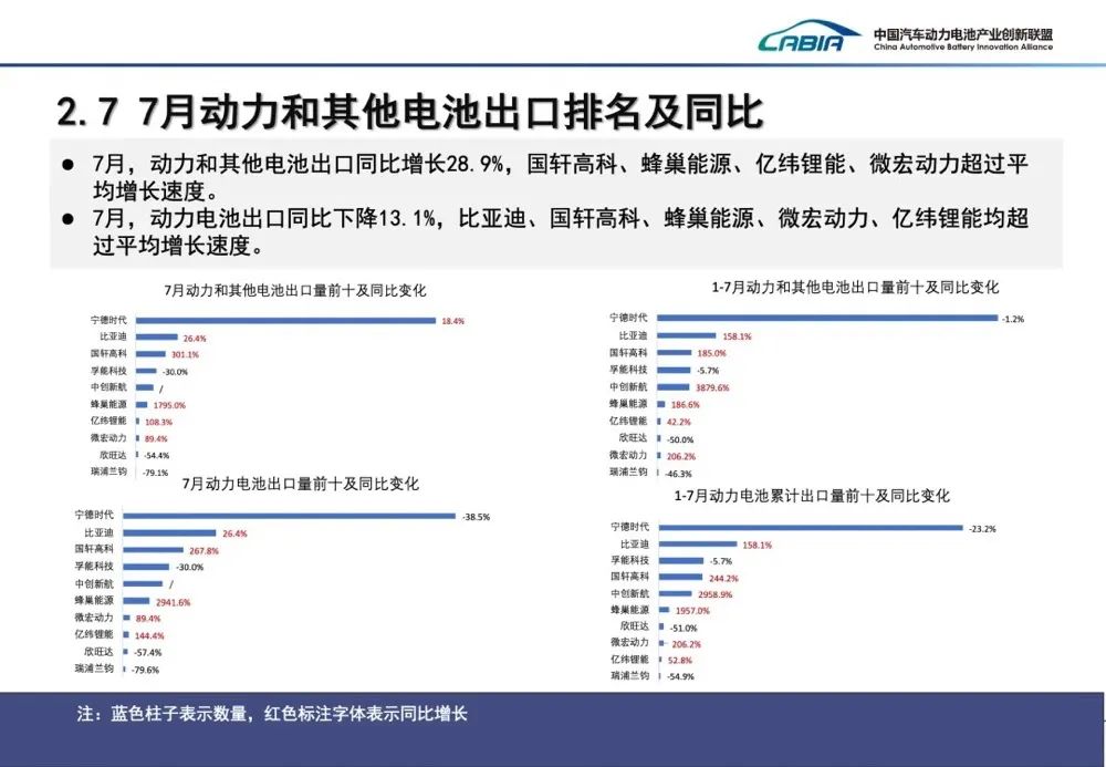 虽然以绝对优势保持出口销冠,但宁德时代同时也是前6名当中,唯一同比下降的,同比降幅达两成。到了7月,累计出口量的降幅进一步扩大至23.2%。