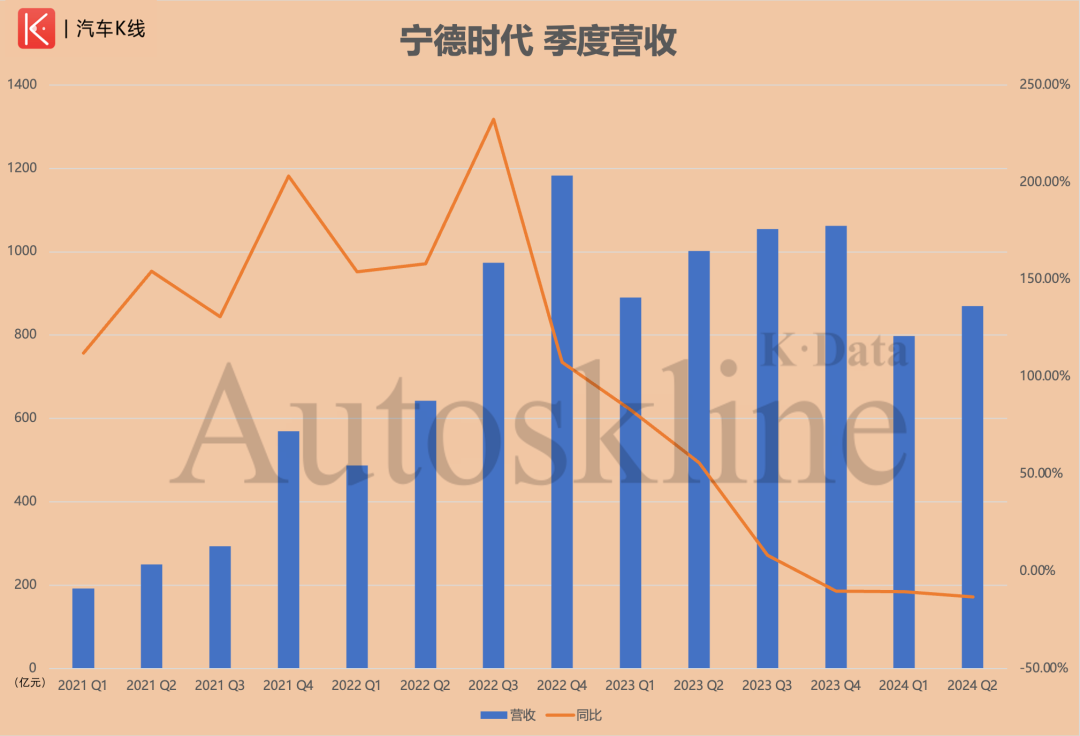 具体到今年二季度,宁德时代营收同比下降13.18%,为869.96亿元,创下季度三连降,与2020年同期出现的两连降颇为相似,和之前连续13个季度同比上涨形成了鲜明反差。