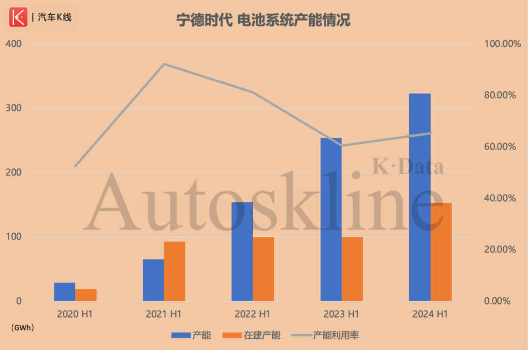 在上述多重表现的背后,宁德时代今年上半年产能达到323GWh,同比提升27.17%、再创历史同期最高的同时,产能利用率仅回升至65.33%,较上年同期提升幅度不超过5个百分点。