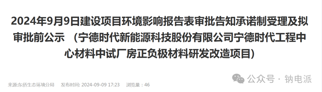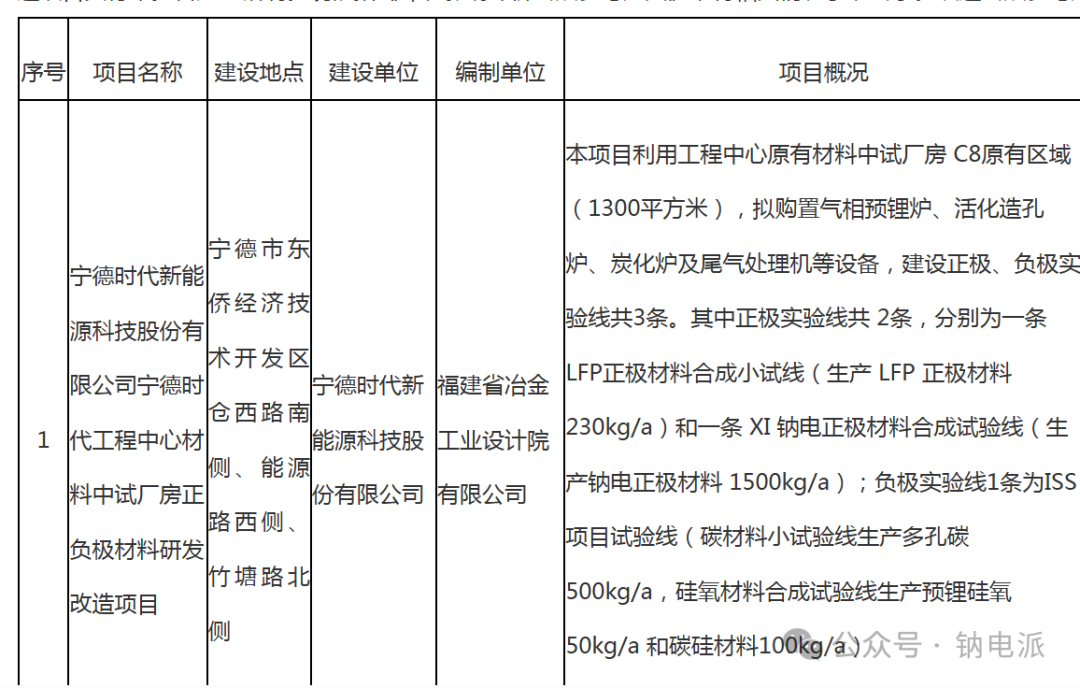 9月9日,宁德时代工程中心材料中试厂房正负极材料研发改造项目环评公示。