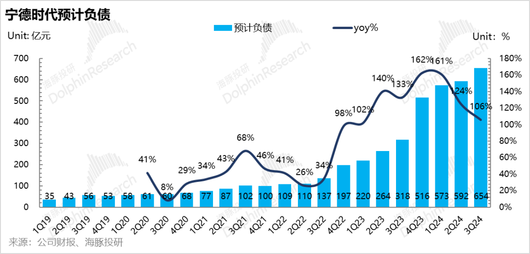 本季度预计负债654亿,环比增加62亿,预计其中质保金30亿元,销售返利32亿元,质保金是由于海外的电池产品需要更多的销售运维,相应的质保金也会更多。而销售返利(作为收入端的冲减)是基于价格联动机制下公司向下游提供的资金返还,由于碳酸锂价格又继续下探,所以相应的计提销售返利更更多。