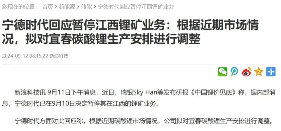 宁德时代调整江西锂矿业务,江西锂矿大厂九岭锂业披露停产检修公告,主要是因为当下碳酸锂价格已跌穿采矿成本线。重庆赣锋动力科技有限公司发布通知,称由于订单减少、产能下降,全面停产三个月,等等。