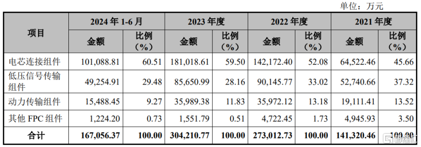 具体来看,2021年、2022年、2023年、2024年上半年(简称“报告期”),公司电芯连接组件的营收占比从45.66%增长至60.51%,低压信号传输组件的营收占比从37.32%降至29.48%,动力传输组件及其他产品营收占比相对较低。