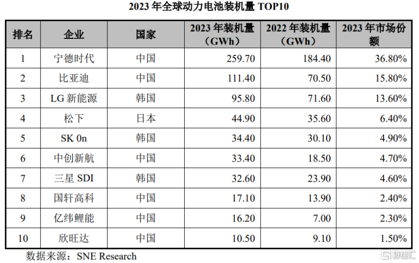 据SNEResearch发布的数据,2023全球动力电池装机量前十大企业依次是宁德时代、比亚迪集团、LG能源、松下、SK On、中创新航、三星SDI、国轩高科、亿纬锂能和欣旺达,其中宁德时代以259.70GWh的装机量稳居第一,市场份额达到36.8%。