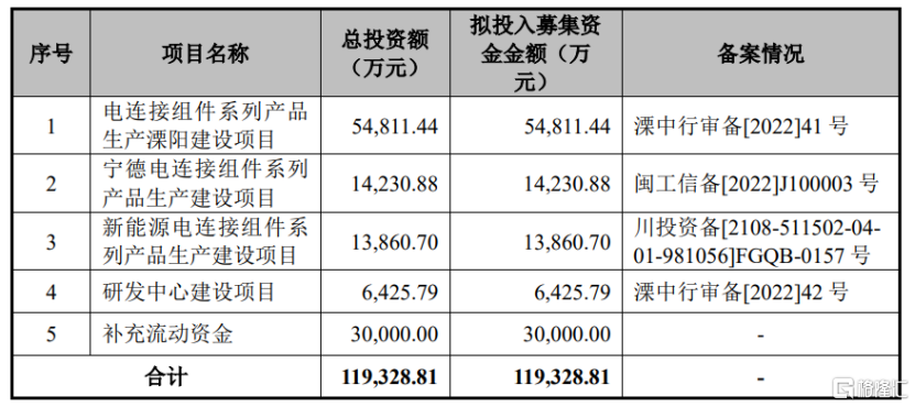 按本次发行价格计算,壹连科技募集资金总额预计约11.92亿元,与11.93亿元的拟投入募集资金金额较为接近。扣除发行费用后,预计募集资金净额约10.81亿元,将用于电连接组件系列产品生产溧阳建设项目、宁德电连接组件系列产品生产建设项目、新能源电连接组件系列产品生产建设项目、研发中心建设项目、补充流动资金。