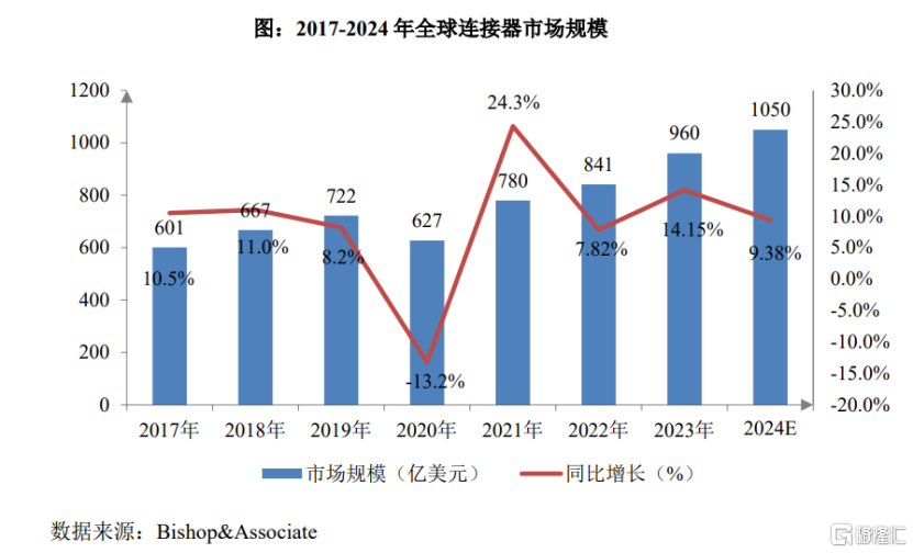 据Bishop&Associate数据,2023年全球连接器的市场规模达到960亿美元,2017年至2023年的复合年均增长率为8%,预计到2024年将增长至1050亿美元。