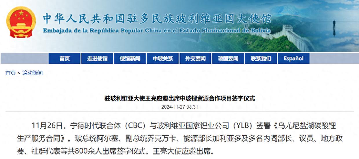 IT之家 11 月 28 日消息,据中国驻玻利维亚大使馆 11 月 27 日发布的消息,11 月 26 日,宁德时代联合体(CBC)与玻利维亚国家锂业公司(YLB)签署《乌尤尼盐湖碳酸锂生产服务合同》。玻总统阿尔塞、副总统乔克万卡、能源部长加利亚多及多名内阁部长、议员、地方政要、社群代表等共 800 余人出席签字仪式。王亮大使应邀出席。