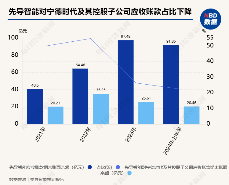 2021年—2023年及2024年上半年,先导智能对宁德时代及其控股子公司应收账款的期末账面余额分别为20.23亿元、35.25亿元、25.61亿元和20.46亿元,而同期先导智能应收账款账面余额持续大幅增长,分别为40.6亿元、64.46亿元、97.49亿元和91.85亿元。以此估算,先导智能对宁德时代及其控股子公司的应收账款占比分别为49.83%、54.69%、26.27%和22.28%。