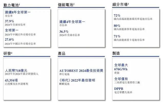 根据高工产研发布的行业报告,宁德时代的动力电池市占率已连续8年蝉联全球第一,2024年的市占率约37.9%。截止同期末,宁德时代已实现动力电池累计装车超1700万辆,全球平均每三辆新能源车,就有一辆装载宁德时代的电池。