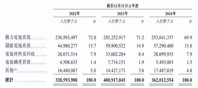 2022年、2023年和2024年,宁德时代的动力电池系统收入占比分别为72.0%、71.2%和69.9%,是宁德时代当之无愧的拳头业务;该公司的“第二增长曲线”储能电池业务的发展态势也可圈可点,占比在2024年上升到了15.8%的新高。