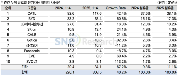 韩国市场调研机构SNE Research发布报告显示,2025前4个月全球动力电池装机量TOP10企业分别为:宁德时代、比亚迪、LG新能源、SK On、中创新航、国轩高科、三星SDI、松下、亿纬锂能、蜂巢能源。