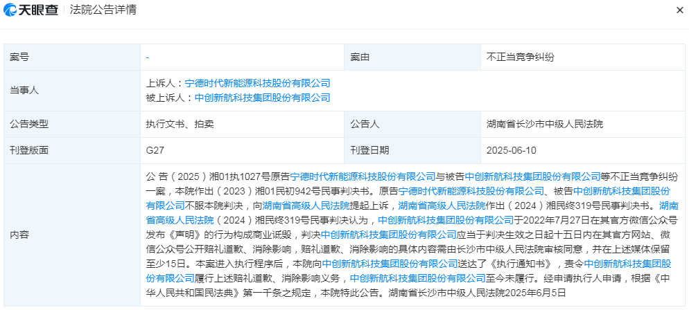 公告显示,中创新航科技集团股份有限公司于2022年7月27日在其官方微信公众号发布《声明》的行为构成商业诋毁,判决中创新航科技集团股份有限公司应当于判决生效之日起十五日内在其官方网站、微信公众号公开赔礼道歉、消除影响。