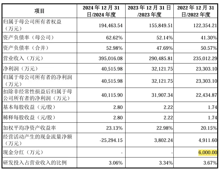 财务数据显示,2022年-2024年(报告期),公司营业收入分别为23.50亿元、29.05亿元和39.50亿元;归母净利润分别为2.33亿元、3.21亿元与4.05亿元。2025年第一季度,公司实现营业收入9.46亿元,归母净利润8847.53万元,与去年同期相比均有所增长。