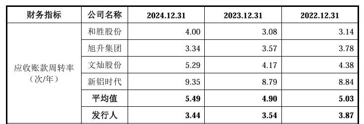 报告期内,公司应收账款余额从6.98亿元激增至13.53亿元,占营收比例从29.71%升至34.25%,应收账款周转率从3.87降至3.44,且始终低于行业均值。2022年-2024年,友升股份应收账款净额占总资产的比例分别为26.76%、30.03%和31.03%,期末应收账款较高。
