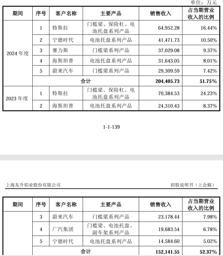 报告期各期,公司对前五大客户的销售收入分别为12.35亿元、15.21亿元和20.44亿元,占公司营业收入的比例分别为52.55%、52.37%和51.75%,占比均超五成,客户集中度较高,特斯拉作为第一大客户一度占据公司24.23%的销售份额。