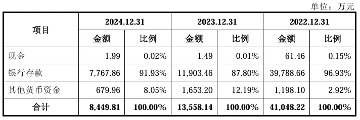 同时,友升股份货币资金规模持续下降。数据显示,公司货币资金余额从2022年的4.1亿元减少至2024年的8449.81万元。截至2024年底,友升股份银行存款仅为7767.86万元。
