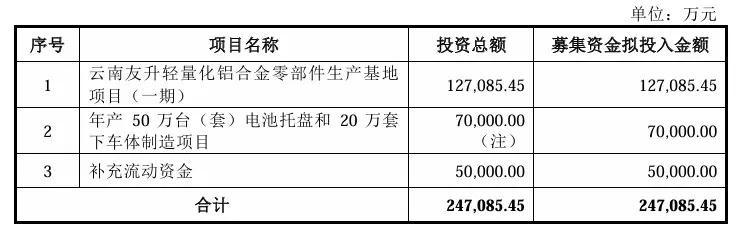 友升股份此次募投项目核心是产能扩张。“云南友升轻量化铝合金零部件生产基地项目(一期)”计划投资12.71亿元,“年产50万台(套)电池托盘和20万套下车体制造项目”拟投入7亿元。