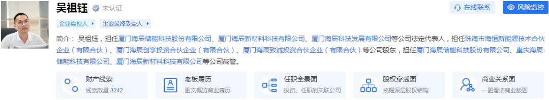 据了解,吴祖钰出生于1986年,今年39岁。2011年8月至2015年12月期间,吴祖钰在担任宁德新能源科技有限公司的工程师;2016年1月至2019年2月,担任宁德时代的工程师;2019年12月,吴祖钰注册成立厦门海辰储能科技股份有限公司,开启创业之旅。