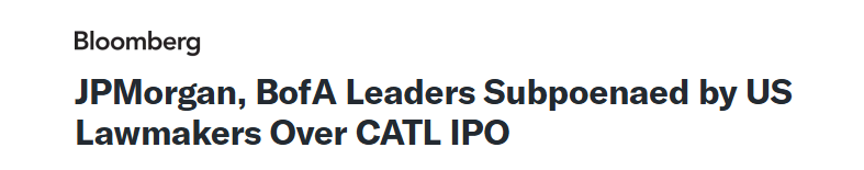 据彭博,7月23日,美国国会众议院针对宁德时代在香港的IPO一事,向摩根大通、美国银行发出传票,要求两家银行提供相关文件。这场风波源于美国立法者对宁德时代上市可能带来的国家安全风险的担忧,折射出中美在高科技领域合作的复杂性。