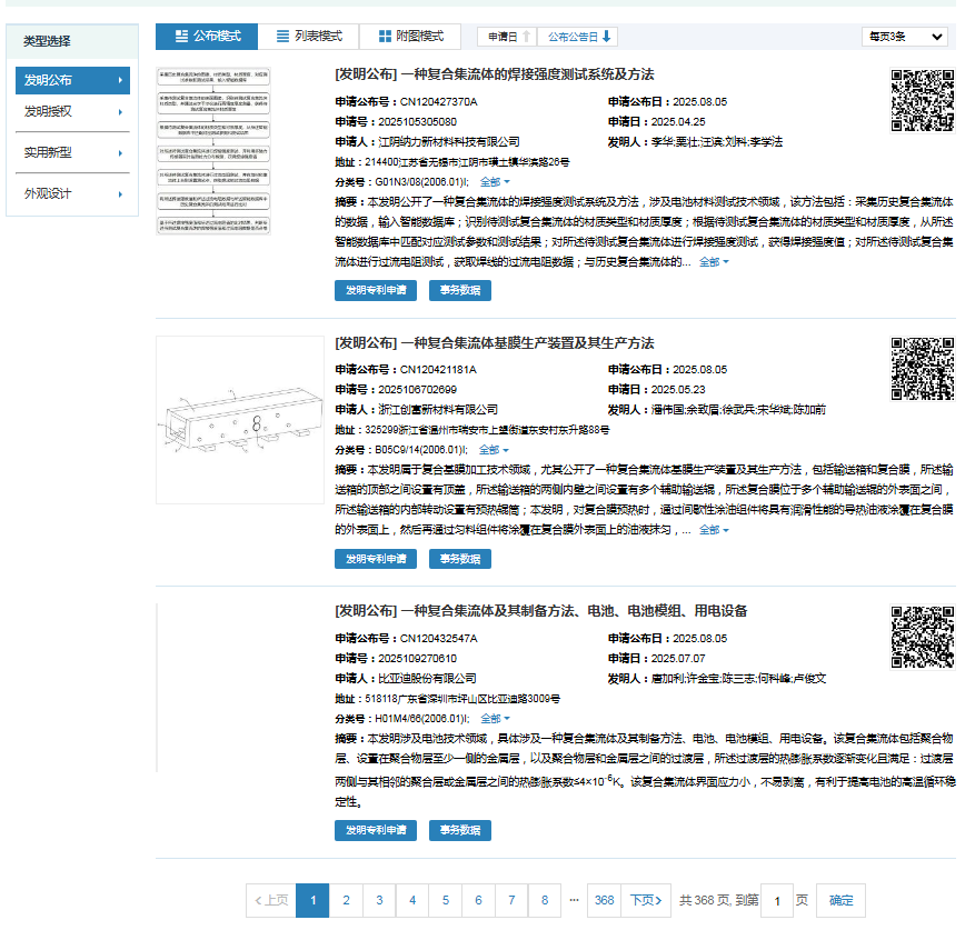 “V观财报”通过中国专利公布公告网站查询“复合集流体”发现,相关发明超千项,申请人包括比亚迪、宁德时代等企业,以及华中科技大学等高校。