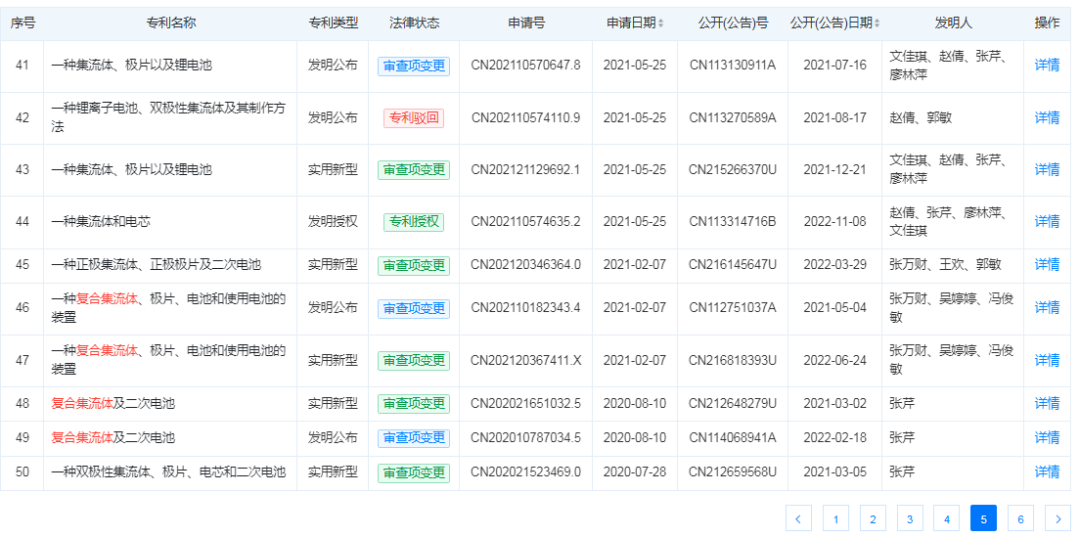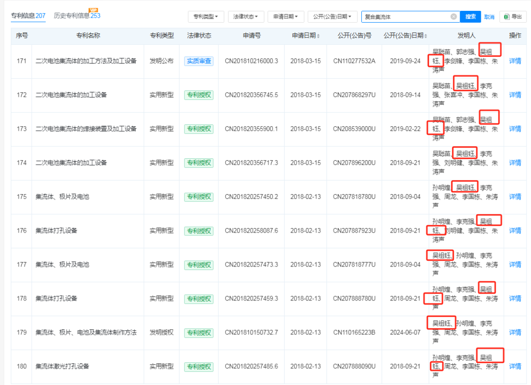 资料显示,宁德时代在复合集流体领域拥有近200条专利信息,发明人中多次出现“吴祖钰”,相关专利名称包括“集流体、极片及电池”“集流体、极片、电池及集流体制作方法”“集流体生产设备”等。