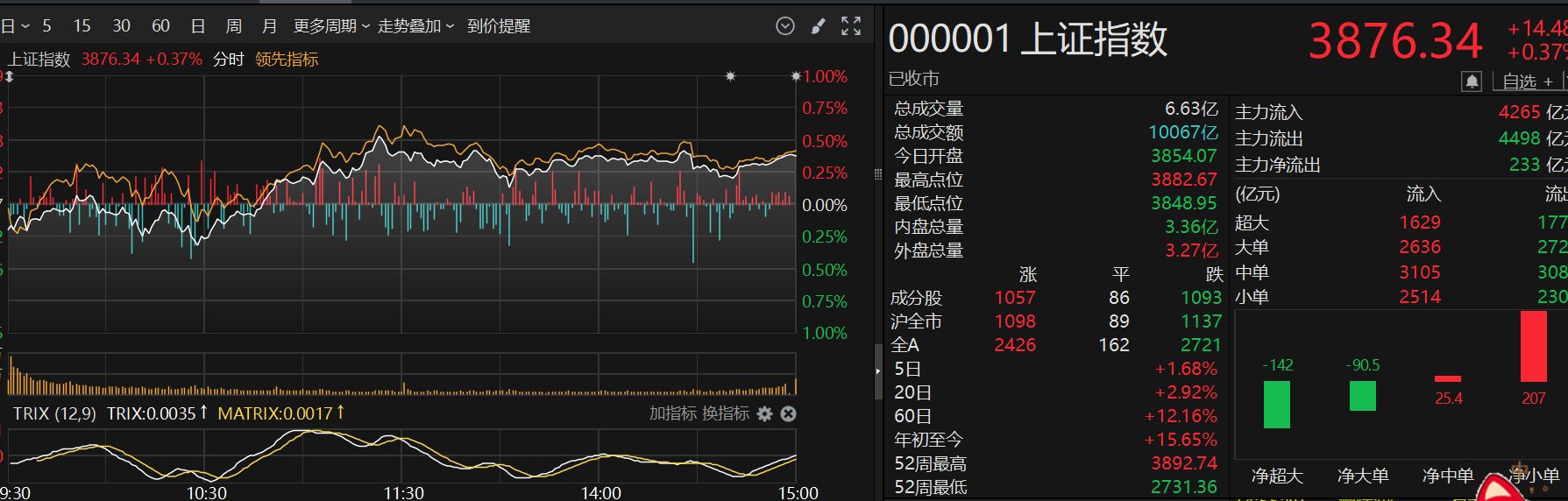 科技龙头新高激发了市场人气。临近午盘,大金融板块再度拉升,指南针涨超10%,创历史新高。首创证券一度涨停,长城证券、陕国投、信达证券、国投资本等跟涨。科技金融一唱一和,助力沪指继续向3900点大关挺进。