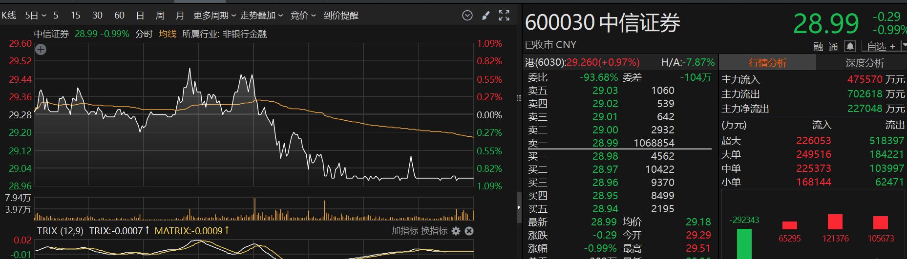 一般来说,大金融板块在指数冲关过程中,往往是中坚力量。沪指3900点关口蓄势多日,从昨日开始,连续两个交易日大金融板块均有异动。首创证券昨日涨停,今日盘中一度涨停,但13:31突然天量卖单涌现,打开涨停板;另外,券商龙头中信证券也出现跳水,最终以绿盘报收,尤其是最后半小时,股价几乎陷入“0”波动。