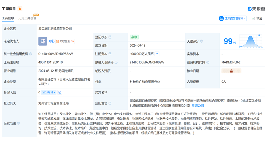 公开资料显示,海口润时新能源有限公司成立于2024年6月12日,最初由宁德时代麾下负责新能源发电项目投资开发的核心主体时代绿能出资设立,直到2025年9月才完成工商变更,成为宁德时代直接控股的全资子公司。