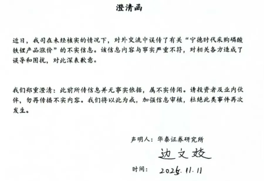 然而,这场狂欢仅维持了一天就被"辟谣"。当晚,华泰证券分析师边文姣发布澄清函(值得注意的,澄清函无公司公章,但市场默认为其个人名义):承认团队"未经核实误传不实信息",所谓宁德时代涨价的传闻"纯属谣言",并对误导市场致歉。