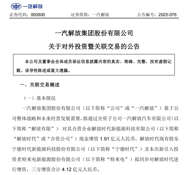 11月27日晚,一汽解放公告称,将通过全资子公司对合营企业解放时代新能源科技有限公司增资1.91亿元。宁德时代及新引入投资者特来电新能源股份有限公司同步增资,三方合计增资4.12亿元。