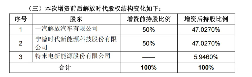 交易完成后,解放时代的注册资本将由9000万元大幅增至约4.91亿元。股权结构上,一汽解放与宁德时代的持股比例将分别调整为47.0270%,充电设施龙头特来电则持有5.9460%的股份。