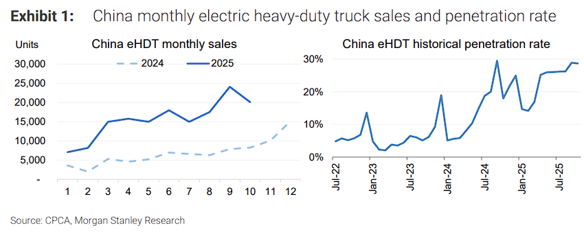 摩根士丹利数据显示,2025年10月中国电动重卡销量同比增长144%,当月渗透率达到约29%,意味着每卖出三辆重卡就有一辆是电动的。该行预测2026年电动重卡渗透率将进一步提升至35%。