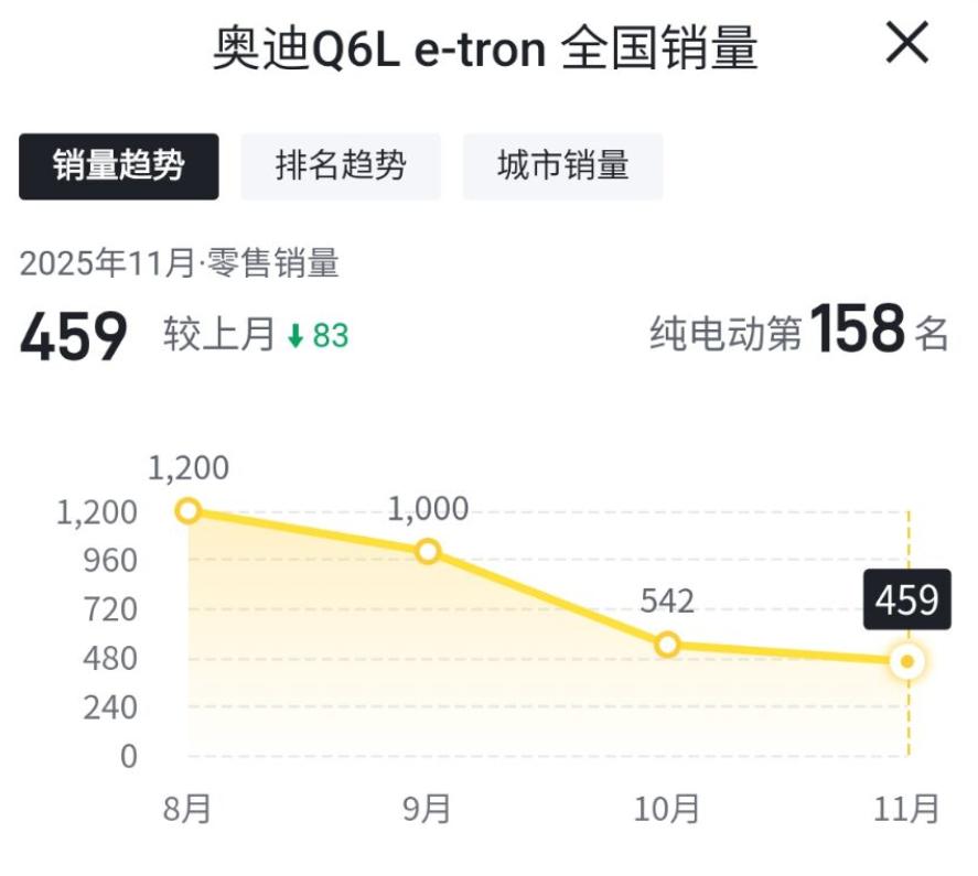 上个月,奥迪Q6L e-tron的销量甚至不到500台,我们就按500台来算,销量表现真的不太行。