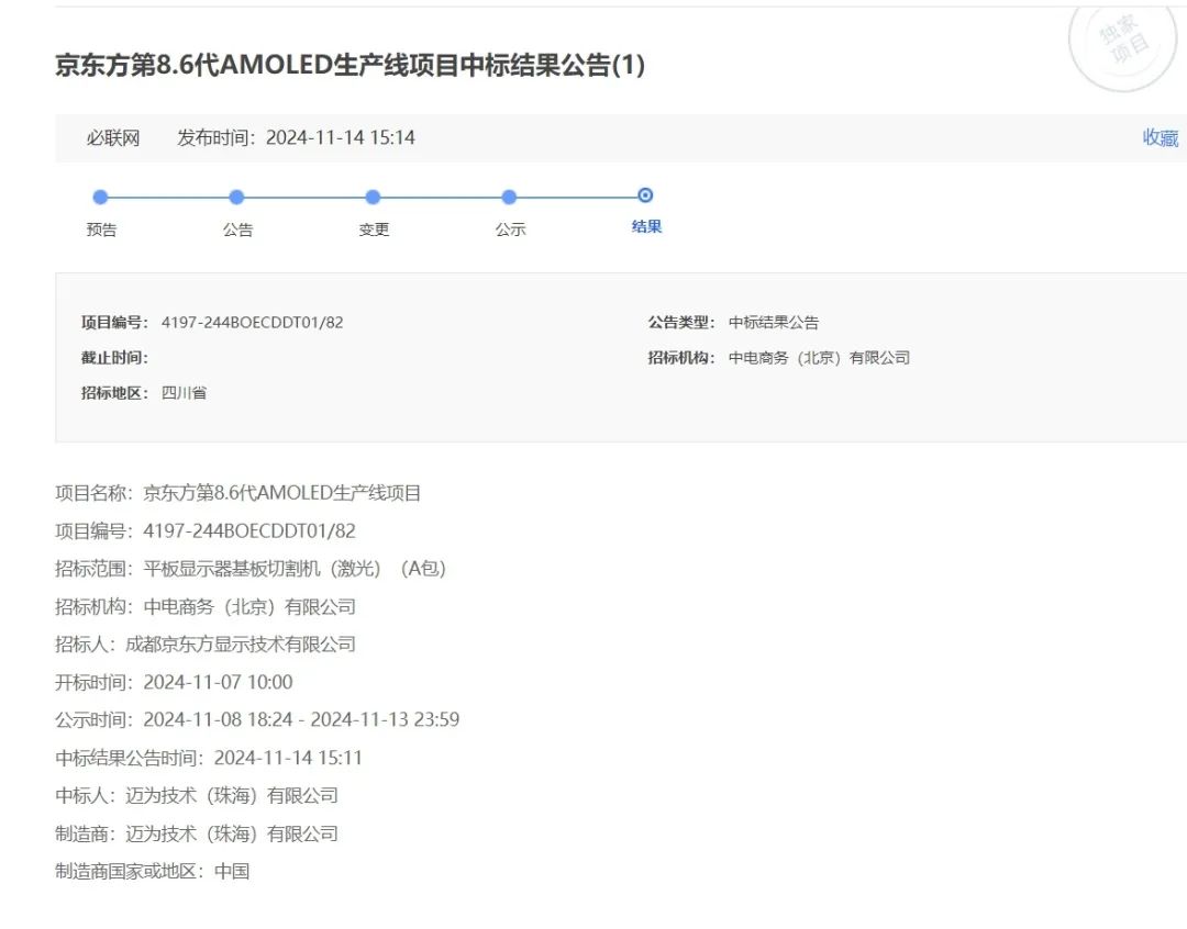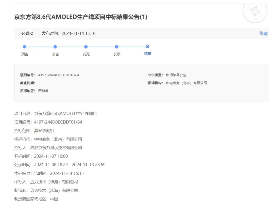 近日,迈为股份全资子公司迈为技术(珠海)有限公司(简称:迈为技术)中标国内显示面板龙头企业京东方的第8.6代AMOLED生产线项目,将向"成都京东方技术有限公司"供应3套平板显示器基板切割机(激光)、2套激光切割机,分别用于柔性OLED面板切割工艺、Hybrid OLED面板TPF半切工艺及TPF废料撕除工艺。