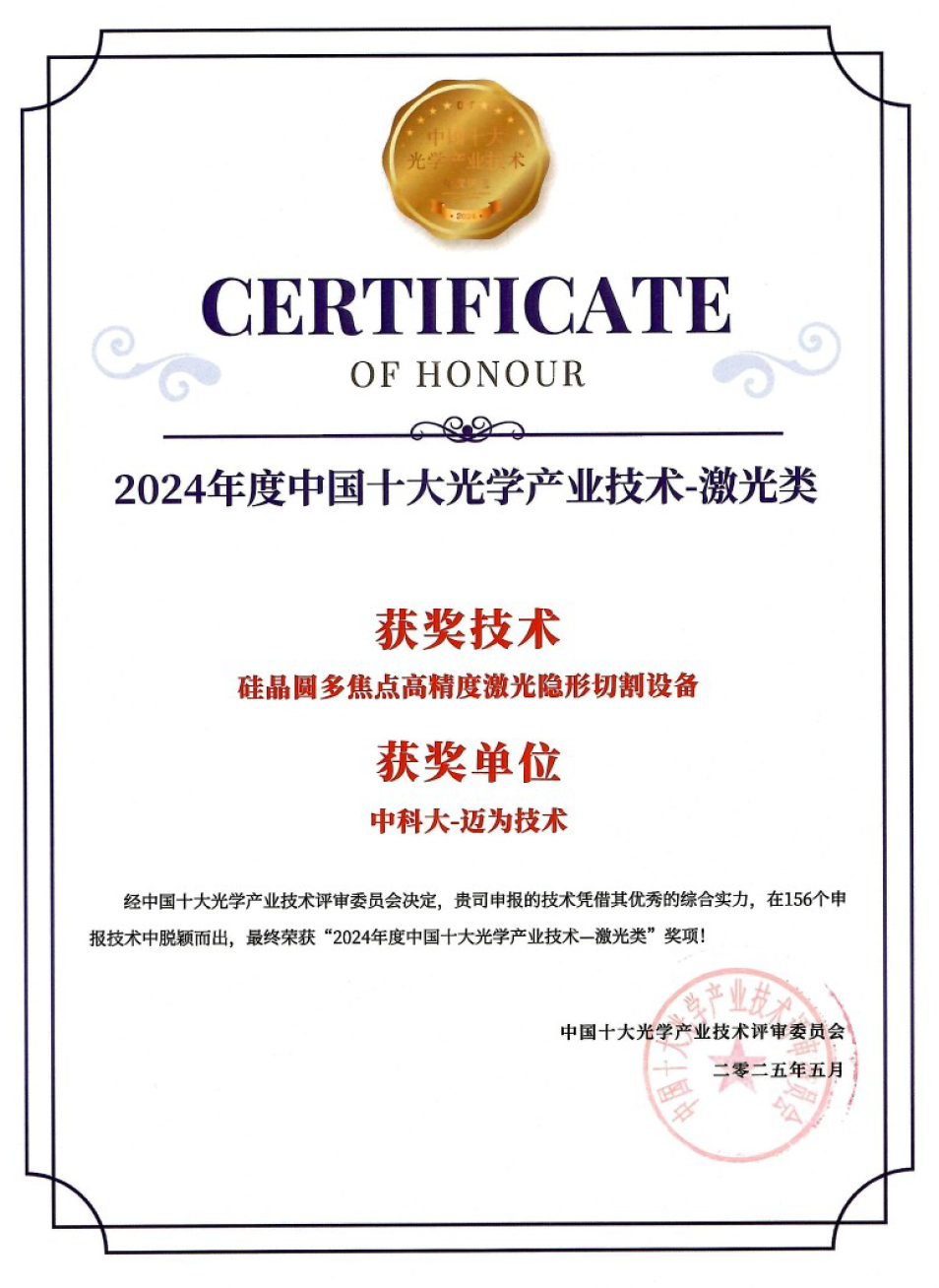 近日,国内光学产业技术的最高荣誉之一——《2024年度中国十大光学产业技术》获奖名单揭晓。凭借在半导体晶圆加工领域的突破性成果,迈为股份控股子公司迈为技术(珠海)有限公司自主研发的硅晶圆多焦点高精度激光隐形切割设备,从全国156项激光与光学领域申报技术中脱颖而出,荣获激光类奖。