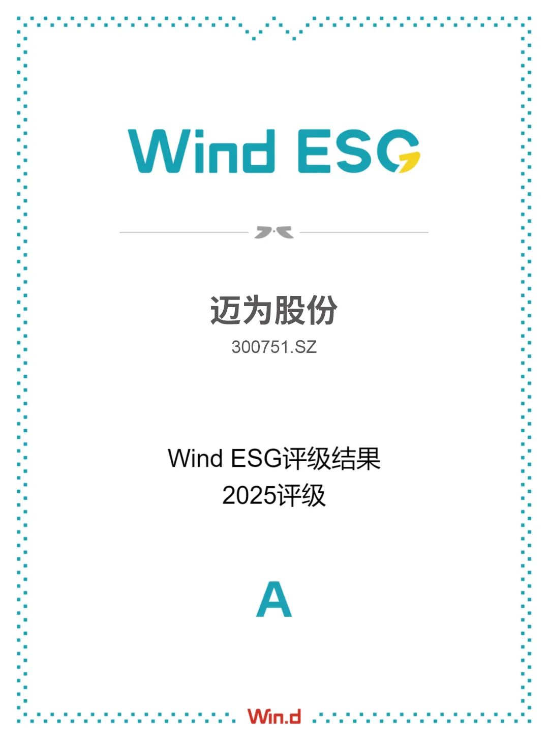 近日,知名ESG评级机构万得(Wind)发布最新评级报告,迈为股份ESG评级由BBB级提升至A级,其综合得分在机械行业394家参评上市公司中位居第78位(前20%),体现了公司在环境、社会与企业治理领域的显著成效再获专业认可。