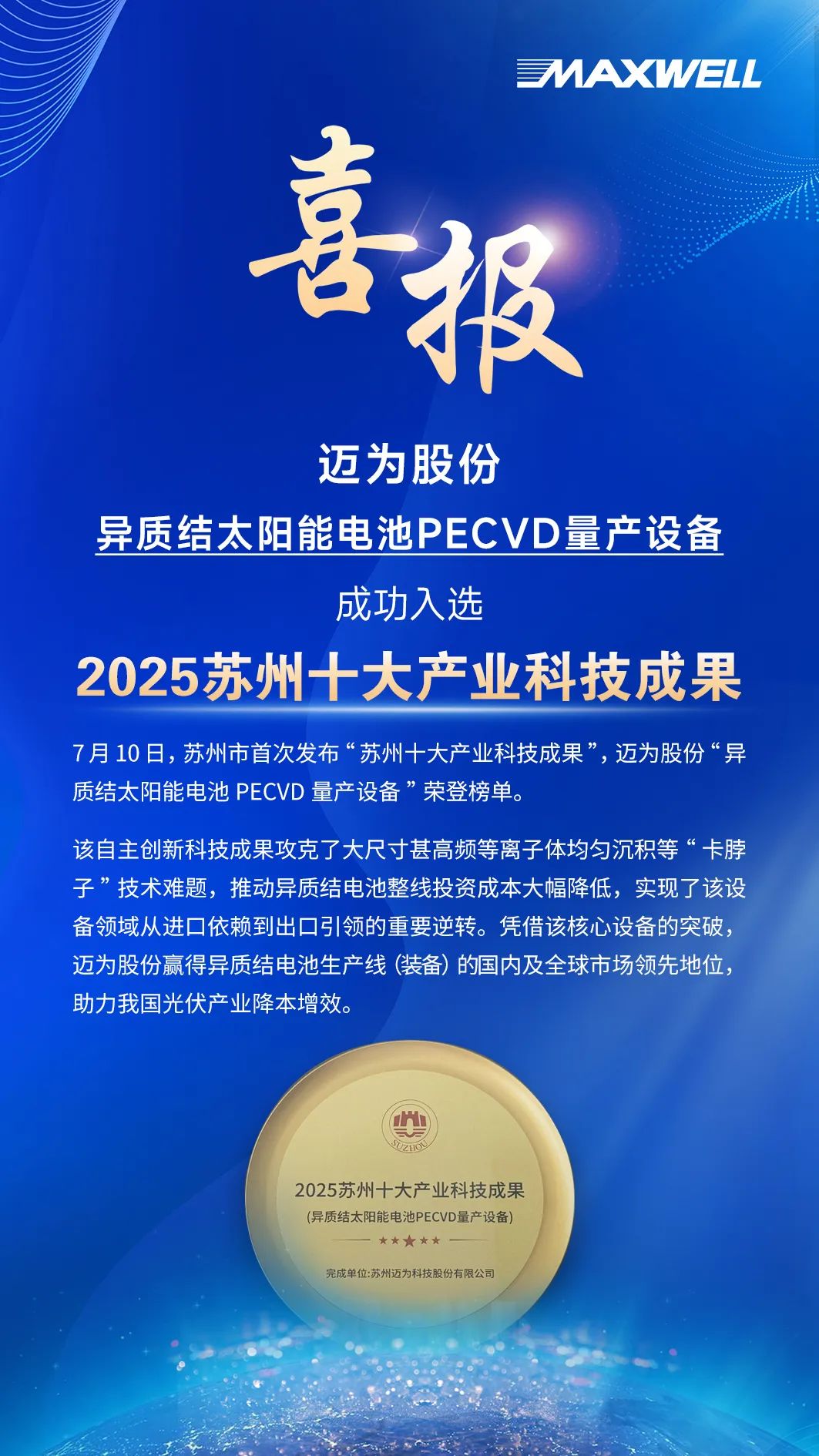 成功入选“苏州十大产业科技成果”,迈为股份PECVD量产设备荣获新誉