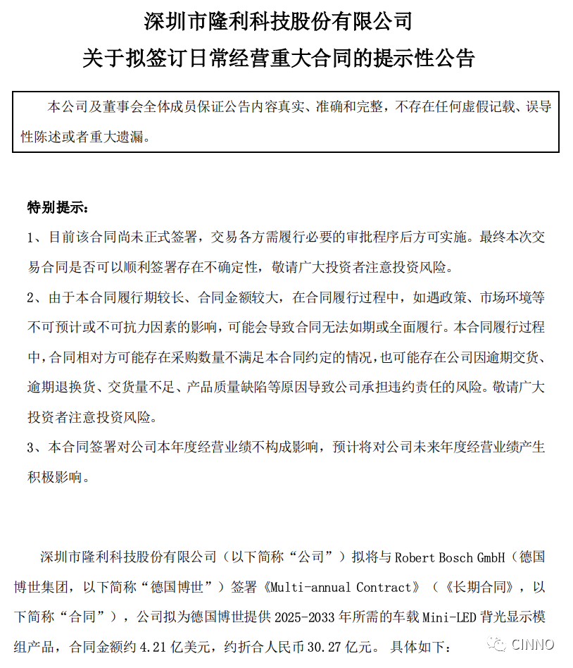 隆利科技10月17日公告,公司拟将与Robert Bosch GmbH(“德国博世”)签署《Multi-annual Contract》(《长期合同》),公司拟为德国博世提供2025-2033年所需的车载Mini-LED背光显示模组产品,合同金额约4.21亿美元,约折合人民币30.27亿元。