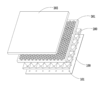 图1、2为本发明提出的一种直下式MiniLED背光模组,包括PCB基板100、反射罩200、光学膜片组300。复合构成光学膜片组300的膜片由扩散膜片301和量子点膜303组成,其中扩散膜片301由聚碳酸酯制成,材料透过率为95%。
