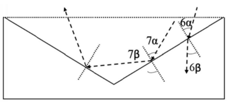 图3为扩散膜片的光学原理图,光线6a和光线7a分别以小于临界角δc的入射角6α和大于临界角δc的入射角7α相遇微透镜结构3011的外表面,入射角为6α的光线以相对于表面的法线的出射角6β进入扩散膜片301,入射角为7α的光线以相对于表面的法线的出射角7β反射进而全反射回量子点膜303。由此,通过扩散膜片301的微透镜结构3011反射来自量子点膜303的光,减少量子点膜303的荧光的损失从而增加亮度。同时避免因为PCB基板100部分吸收红绿光RG,造成的面光源的RGB比例失衡而出现偏黄的光。