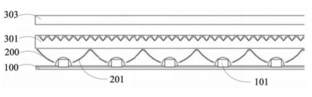 隆利科技的Mini-LED背光模组专利,通过让反射罩和扩散膜片能协同作用,不仅能够避免产生光斑,实现光的均匀分布,而且还能够提高观测角度的亮度。