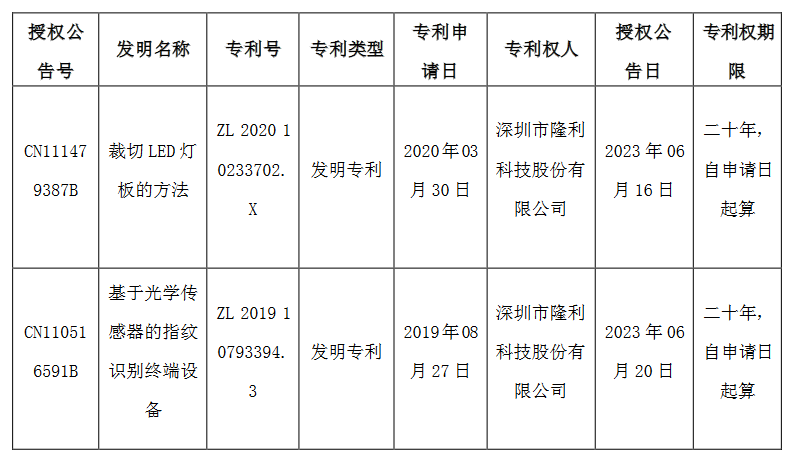 6月26日,隆利科技发布公告宣布,公司于近日收到由国家知识产权局颁发的两项发明专利证书,专利名称分别为“裁切LED灯板的方法”和“基于光学传感器的指纹识别终端设备”。