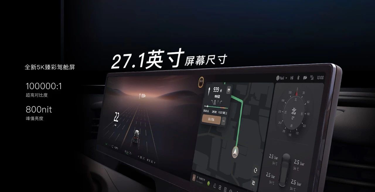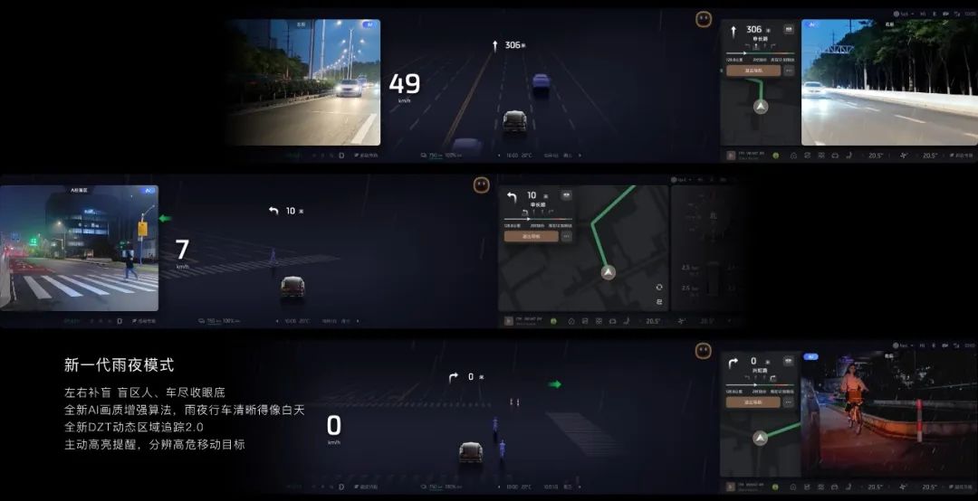 在智能体验方面,智己LS6“全新全场景数字座舱”为用户提供了极致的交互体验,其中,27.1英寸的5K巨幅驾舱屏采用了隆利科技Mini-LED显示技术,100000:1超高对比度,800nit峰值亮度,并且还贴心地设置了“雨夜模式”,盲区补盲画面增大近40%,搭配全新AI画质增强算法与DZT动态区域追踪2.0系统,在极端恶劣天气环境下视野更清晰、行车更安全。