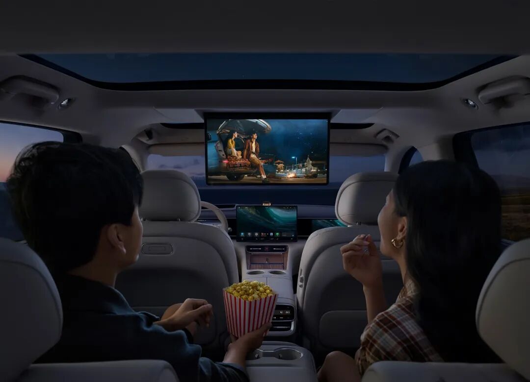 内饰方面,全新问界M7新增的17.3英寸后排吸顶娱乐屏,采用轻量化设计,收纳时隐匿于车顶,展开后提供接近家用电视的显示效果,支持触控操作与多设备投屏,满足动漫观影、在线追剧、亲子陪学等多维体验,适配全龄段乘客的娱乐与学习需求。