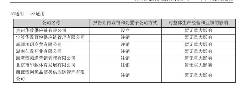 《每日经济新闻·将进酒》记者注意到,今年上半年,华致酒行也注销了6家子公司,其中包括宁波华致百悦供应链管理有限公司、湖南仁致药业有限公司等;同时设立了贵州华致供应链有限公司,由华致酒行100%持股。